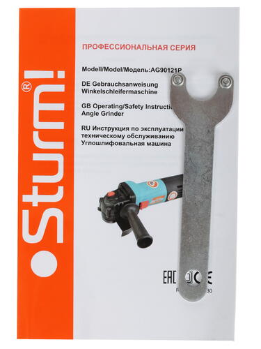 Получая питание от розетки однофазной сети, углошлифовальная машина Sturm! AG90121P подключается к ней с помощью 2-метрового сетевого шнура. Удерживать эту УШМ с защищенным от попадания пыли корпусом помогает удобная двухпозиционная рукоятка. Инструмент комплектуется фланцевым ключом, необходимым для замены оснастки.