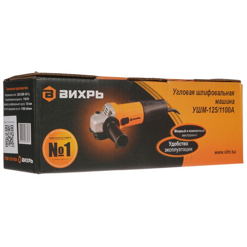 В основе Вихрь УШМ-125/1100А используется щеточный двигатель. Благодаря его мощности в 1100 Вт скорость вращения насадки может достигать 11000 об/мин, что позволит легко выполнять любые типы работ. Для их выполнения в данной модели используется диск размером 125 мм, который устанавливается при помощи классического крепления размером 22.2 мм.
