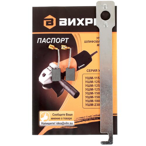 Инструмент Вихрь УШМ-230/2300 действует от электросети и дополняется ограничителем пускового тока. Конструкция дополнена быстрозаменяемыми угольными щетками и надежной фиксацией шпинделя. Устройство поставляется в удобном защитном кожухе вместе с запасной ручкой и ключом для быстрой смены рабочего диска.