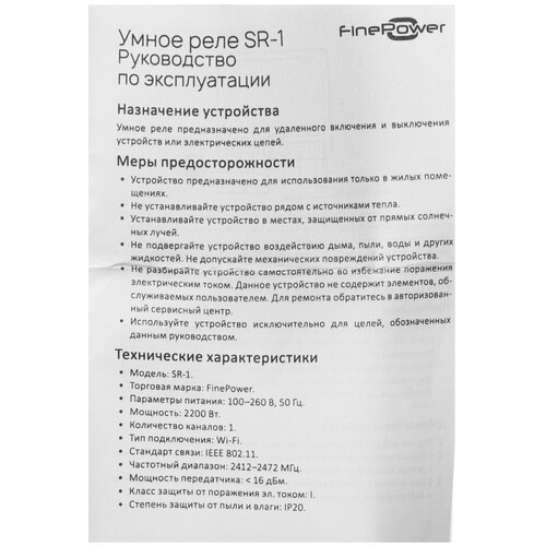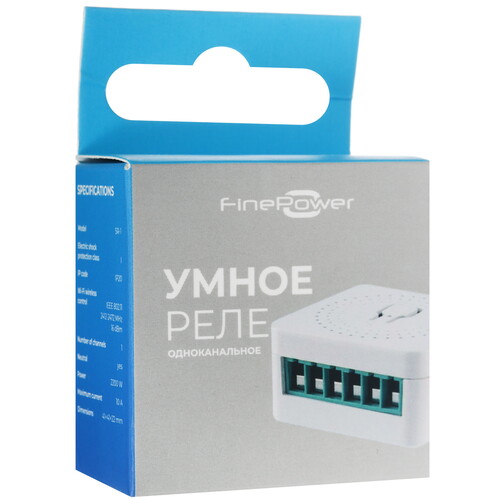 Связь с контроллером умного дома по Wi-Fi умное реле FinePower SR-1 поддерживает на расстоянии до 50 м. Через этот компонент можно подключить нагрузку с энергопотреблением до 2.2 кВт и потребляемым током до 10 А. Прибор отличается минимальной пылезащитой корпуса по классу IP20 и предполагает работу в диапазоне температур от от -10 до 40 °С.