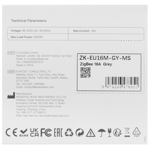 16 А, 95 - 245 В, 3 кВт, Zigbee, помощник-Alexa, Google Ассистент, Алиса, серый