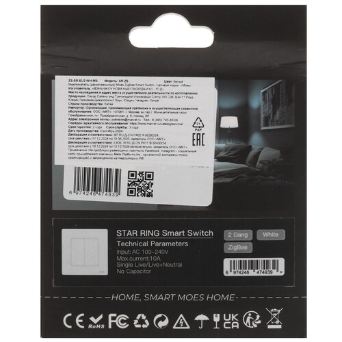 Умный выключатель MOES SR-ZS – двухкнопочная модель в пластиковом корпусе белого цвета, которая поддерживает интеграцию в системы умного дома Amazon Alexa, Google Home и Tuya Smart. С помощью этого выключателя можно управлять освещением, кнопки позволят включать и выключать электрический свет. Умным выключателем MOES SR-ZS помимо дистанционного и кнопочного управления можно также управлять при помощи голосовых помощников Alexa и Google Ассистент или посредством приложения, которое устанавливается на смартфон. Подсветка выключателя обеспечит удобство при использовании в темноте.