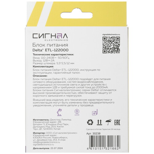 Адаптер питания сетевой Delta+ ETL-122000 рассчитан на подключение к сети с напряжением от 110 до 240 В. Модель поддерживает функцию защиты нагрузки от короткого замыкания и перегрузок. Выходное напряжение адаптера регулируется автоматически.