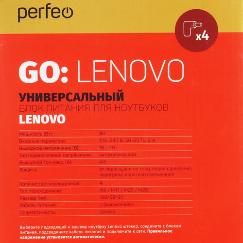 Адаптер питания сетевой Perfeo ULA-90L черного цвета предназначен для подключения ноутбука к электросети. Модель укомплектована 4 переходниками и совместима с мобильными компьютерами Lenovo. Регулировка выходного напряжения производится автоматически в диапазоне от 16 до 20 В. Максимальная мощность на выходе адаптера составляет 90 Вт. Устройство рассчитано на работу от сети с напряжением от 100 до 240 В.