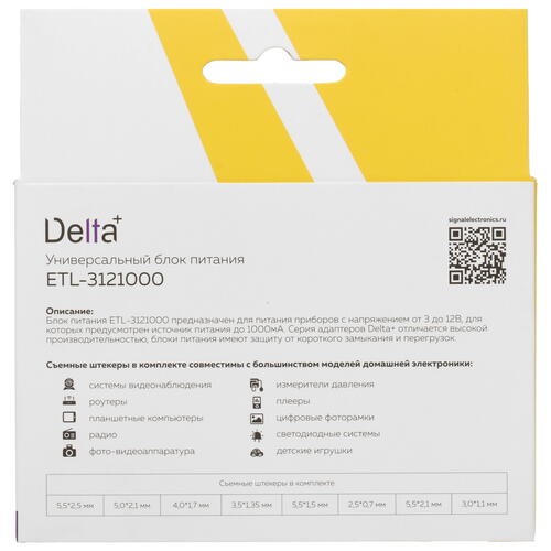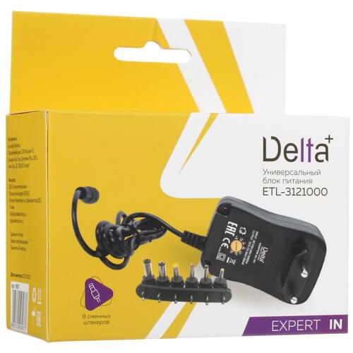 Адаптер питания сетевой Delta+ ETL-3121000 предназначен для обеспечения питания ноутбуков и нетбуков. Устройство, конструктивно представляющее из себя моноблок, подключаемый непосредственно в розетку, укомплектовано 8 разъемами. Минимальное выходное напряжение, обеспечиваемое адаптером – 3 В. Соответствующий максимальный показатель – 12 В. Для изменения выходного напряжения используется надежный поворотный регулятор. Помимо разъемов, в комплектацию адаптера Delta+ ETL-3121000 входит чехол. Высокий уровень качества материалов и компонентов, которые были использованы при производстве адаптера, обуславливает значительную длительность его срока службы.