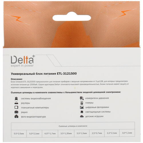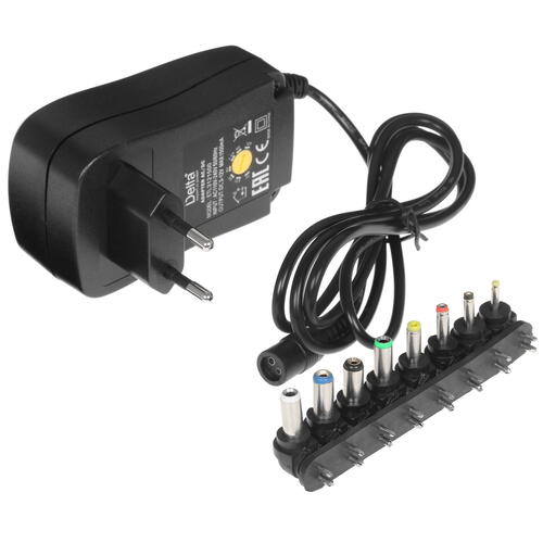 Адаптер питания сетевой Delta+ ETL-3121500 будет полезен частным и профессиональным пользователям, которым требуется универсальное устройство, с помощью которого обеспечивается питание нетбуков и ноутбуков с разъемами разного конструктивного исполнения. В комплект поставки адаптера входят 8 разъемов разных типов. Выходное напряжение устройства изменяется от 3 до 12 В. Для изменения этого параметра используется переключатель, имеющий вид ползунка. Максимальный выходной ток, обеспечиваемый устройством, равен 1.5 А. Предусмотрена функция защиты нагрузки.