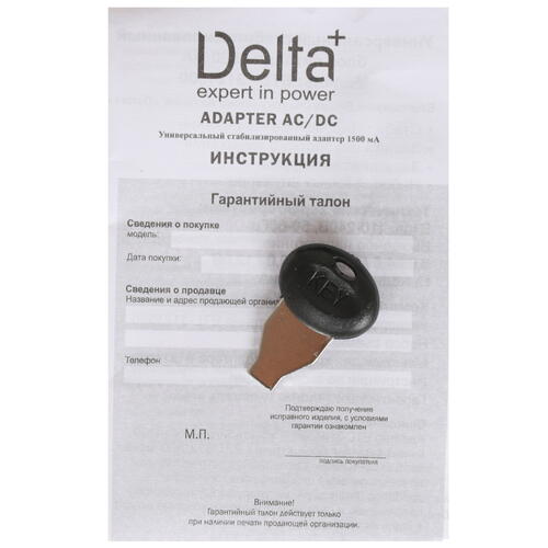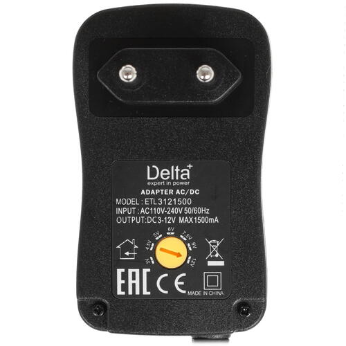 Адаптер питания сетевой Delta+ ETL-3121500 подключается к электрической розетке без использования кабеля, напрямую. Помимо разъемов, в комплект поставки устройства входит практичный чехол черного цвета, украшенный логотипом производителя. Корпус адаптера имеет практичный черный цвет.