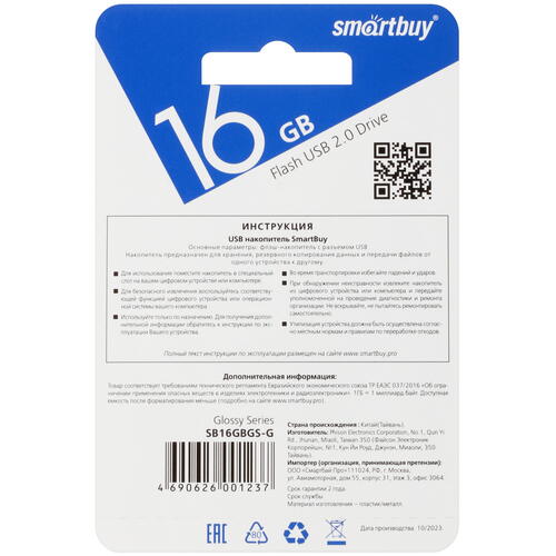 Память USB Flash 16 ГБ Smartbuy Glossy [SB16GBGS-G] [5446905]