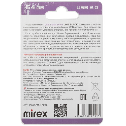 Пластиковый корпус памяти USB Flash 64 ГБ Mirex LINE [13600-FMULBK64] имеет монолитную конструкцию. В наличии защитный колпачок разъема. Флеш-накопитель соответствует требованиям стандарта USB 2.0.