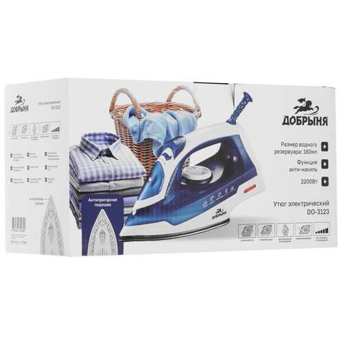 Утюг Добрыня DO-3123 белого цвета оснащен антипригарным покрытием, которое легко скользит по материалам любых видов и не прилипает даже к деликатным тканям. Функция «паровой удар» помогает разгладить даже сильные складки и заломы. Режим регулировки подачи пара позволяет вручную регулировать силу воздействия в зависимости от плотности ткани. Утюг может гладить с предварительным разбрызгиванием воды или всухую.