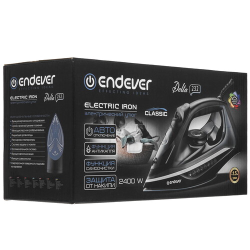 Утюг Endever DELTA-232 оснащен системой очистки от накипи. Она помогает избежать забивания каналов подачи пара и поддерживает прибор в рабочем состоянии. Противокапельная система исключает появление на тканях разводов и следов от капель воды. Утюг можно использовать в вертикальном режиме. Это позволяет отпаривать занавески на окнах или одежду прямо на вешалке. Благодаря желобку вдоль корпуса прибор разглаживает участки вдоль пуговиц, молнии. Модель оснащена функцией автоматического отключения. Система прекращает подачу питания, если устройство длительное время остается в неподвижном состоянии. Это помогает избежать пожароопасных ситуаций.