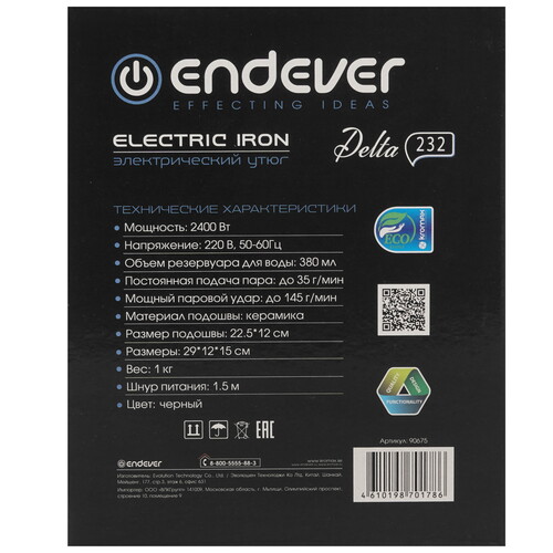 Утюг Endever DELTA-232 черного цвета мощностью 2400 Вт сможет разгладить даже портьеры и плотную одежду. Керамическая подошва равномерно нагревается по всей площади и не прожигает материал. Она подходит для работы с деликатными тканями. С помощью парового удара можно устранить сильные заломы даже на пододеяльнике, который сложен в два раз. Вы сможете регулировать температуру и силу парового воздействия вручную. Это позволит настроить устройство под ткани определенного типа и плотности.