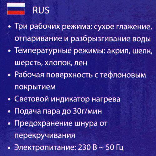 2400 Вт, подошва - нержавеющая сталь, тефлон, пар 30 г/мин