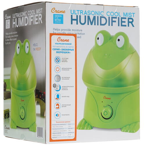 Увлажнитель воздуха Crane EE-3191 "Лягушка" выглядит, как настольная сувенирная игрушка. Благодаря этому прибор гармонично вписывается в интерьер детской комнаты, попутно улучшая качество воздуха. Устройство способно обслужить комнату размерами до 23 кв.м. Система действует непрерывно в течение суток и дополняется функцией автоотключения.