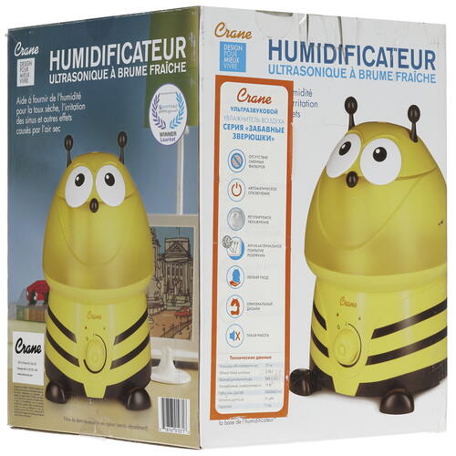 Увлажнитель воздуха Crane EE-8246 "Шмель" представлен в ярком игрушечном дизайне, благодаря чему отлично подходит для оснащения детской комнаты. Устройство потребляет 19 Вт, работает непрерывно в течение суток и уверенно обслуживает комнату до 23 кв.м. Настольный прибор дополнен удобным механическим управлением.