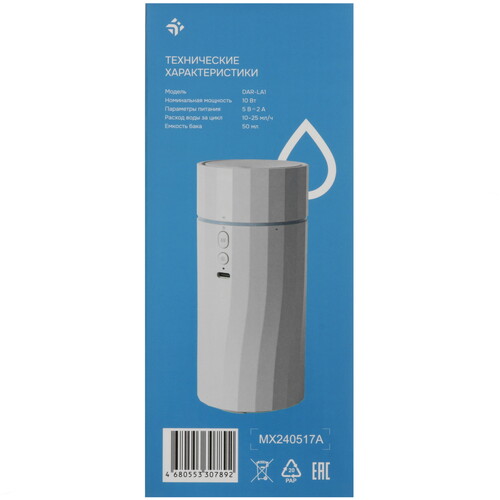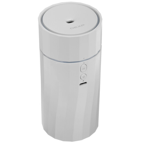 Увлажнитель воздуха DEXP DAR-LA1 выполнен в сером настольном корпусе с кнопочным управлением и приятной подсветкой. Мощности устройства хватает для увлажнения воздуха в пределах 10 м². Модель с емкостью на 50 мл и расходом воды 10-25 мл/ч выдерживает до 4 ч непрерывной работы. Аккумуляторный увлажнитель воздуха с зарядкой по USB можно поставить в любом удобном месте комнаты: на компьютерном столе, рядом с цветами, на прикроватную тумбу.