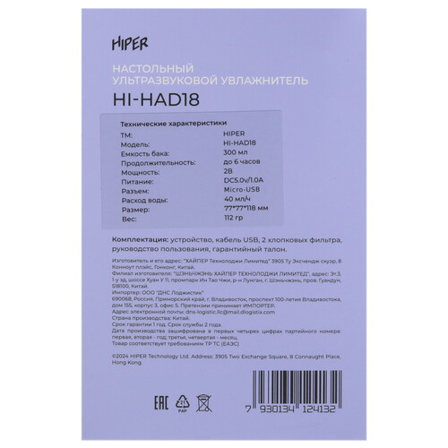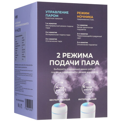 Увлажнитель воздуха HIPER HI-HAD18 подходит для обслуживания площади до 10 м². Ультразвуковой мембранный механизм превращает воду в мелкодисперсный холодный пар и создает благоприятный микроклимат в помещении. Резервуар объемом 0.3 л и расход 40 мл/ч обеспечивают до 6 часов увлажнения в интервальном режиме и до 4 часов в непрерывном режиме. Разноцветная подсветка создает приятное атмосферное освещение и может использоваться в качестве ночника. Увлажнитель воздуха HIPER HI-HAD18 получает питание от сети через кабель USB.
