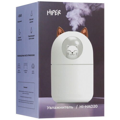 Ультразвуковой увлажнитель воздуха HIPER HI-HAD20 белого цвета устанавливается на стол и кроме стандартной функции может выполнять роль светильника благодаря встроенной LED-подсветка корпуса. Интенсивность подачи испарений можно настраивать по своему усмотрению с помощью механического регулятора спереди устройства.