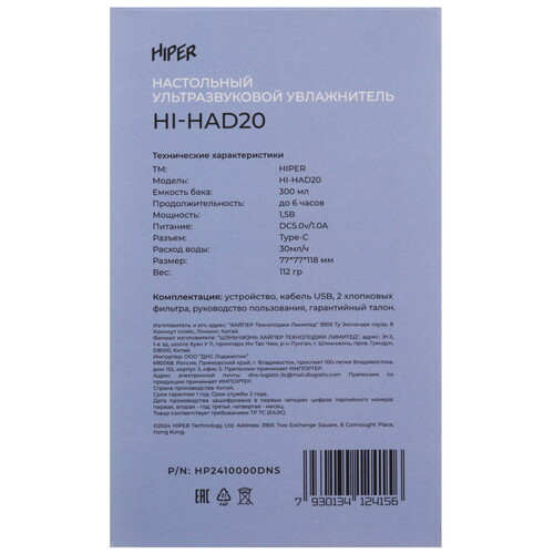 Увлажнитель HIPER HI-HAD20 работает в автоматическом режиме и расходует воды из резервуара объемом 0.3 л со скоростью 30 мл/ч. При этом непрерывно устройство может работать на протяжении 6 ч при условии периодического подливания воды. Мощности и интенсивности распыления хватает, чтобы увеличить влажность в помещении площадью 10 м².