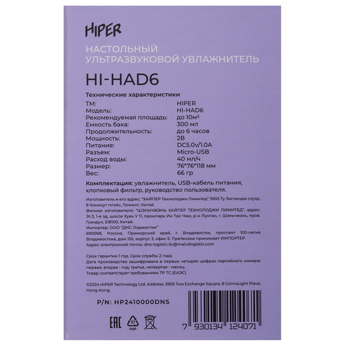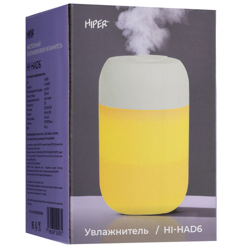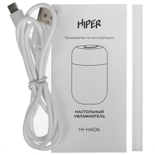 Увлажнитель воздуха HIPER HI-HAD6 получает питание по кабелю с разъемом USB. Он предназначен для настольного размещения. Благодаря ультразвуковой мембране вода превращается в мелкодисперсный холодный туман и распыляется в помещение через отверстие на крышке.