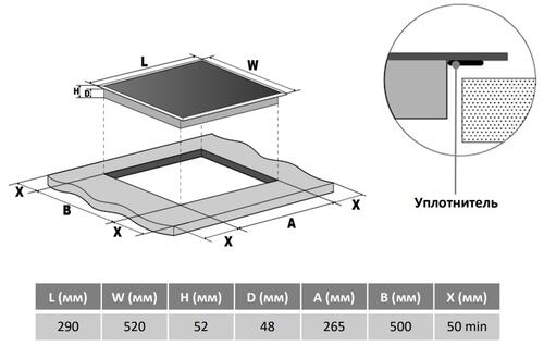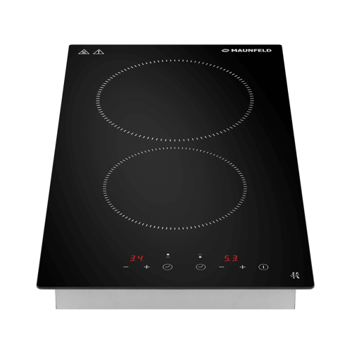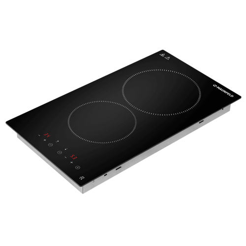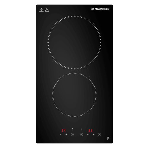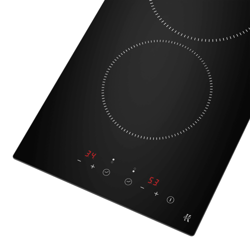 Сенсорное управление с красной индикацией, расположенное на фронтальной поверхности, дает возможность: выбрать уровень мощности для каждой конфорки (от 0 до 9); выставить таймер (от 1 до 99 минут) для отключения одной или двух варочных зон по истечении заданного времени.