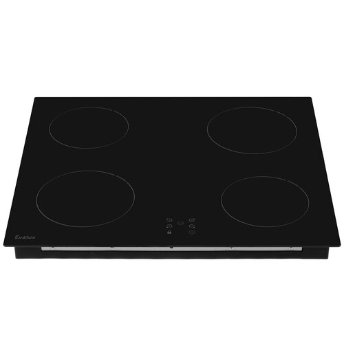 Прибор имеет высокий КПД, поэтому еда на нем готовится быстро. На панели находятся сразу 4 конфорки диаметром 16 и 18 см. Опция распознавания посуды не позволит прибору включиться, если вы вдруг забыли поставить на него кастрюльку. С лицевой стороны индукционной варочной поверхности Evelux HEI 640 B располагается панель управления со встроенным таймером. На время готовки она блокируется от вмешательства маленьких любителей кулинарии. Индикатор остаточного тепла погаснет, как только температура конфорки упадет до 60 градусов.