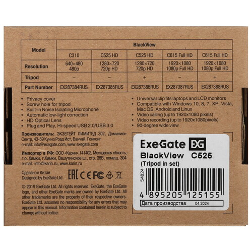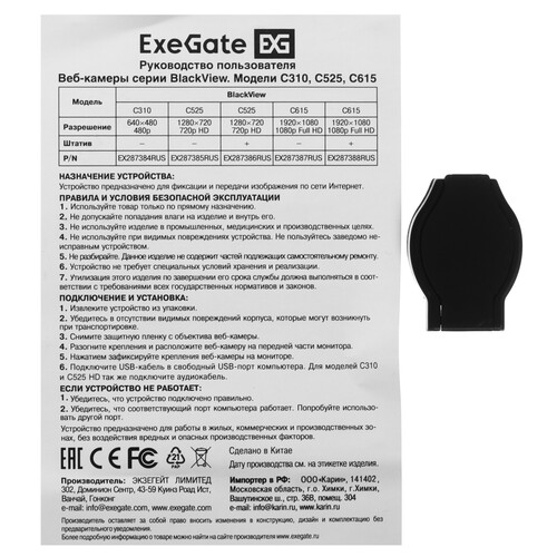ExeGate BlackView C525 HD Tripod выполнена в черном корпусе с универсальным креплением для фиксации на ноутбуке или мониторе с рамкой разной толщины. Модель дополнена триподом для настольной установки. Есть защитная шторка для сохранения конфиденциальности. Возможность наклона на 40° и поворота на 65° позволяет настроить удобный угол наклона в зависимости от высоты компьютерного стола и вашего роста.