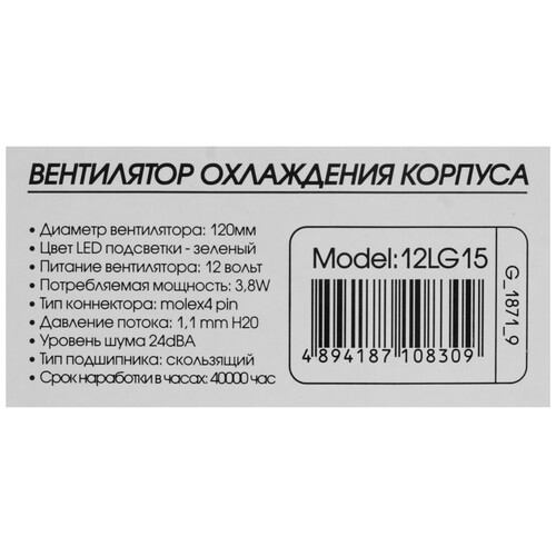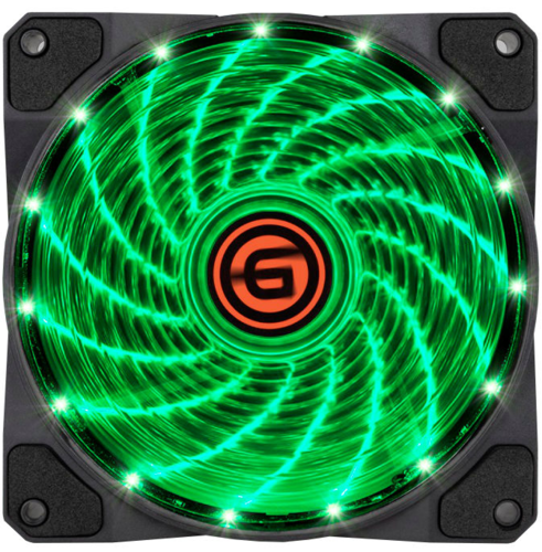 Компактный черный вентилятор GiNZZU LED 12LG15 с белой крыльчаткой обладает размерами 12x12 см. Конструкция оснащена гидродинамическим подшипником и плотной антивибрационной прокладкой, что способствует тихой и безотказной работе. На внутреннем кольце расположено 15 светодиодов, создающих приятное зеленое свечение.