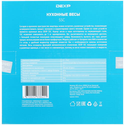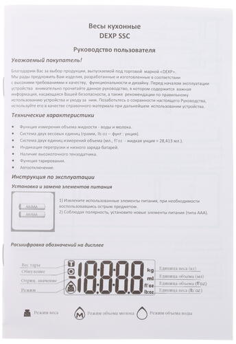 Для определения веса продуктов за вычетом массы их упаковки в DEXP SSC предусмотрена функция тарокомпенсации. Чтобы устройство не тратило понапрасну ресурсы элементов питания, в нем предусмотрена система автоматического выключения. Прочность и долговечность данной модели придает корпус, выполненный из качественного металла. Управляются представленные весы при помощи кнопочной панели. На выбор пользователя предоставляется большое количество единиц измерения, среди которых есть привычные нам граммы и миллилитры.