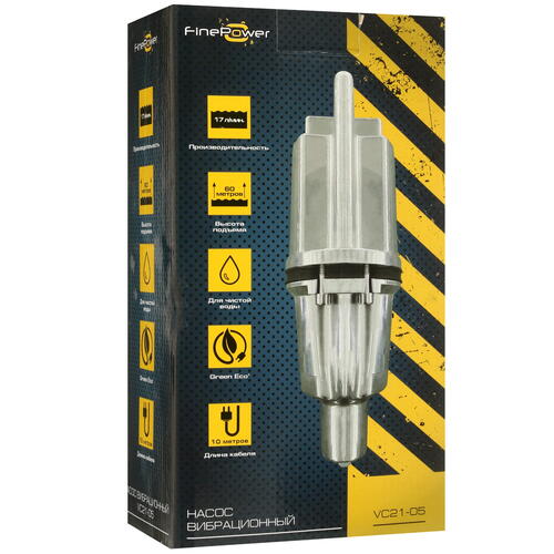 Корпус насоса Finepower VC21-05 изготовлен из сплава алюминия и отличается полной герметичностью, соответствующей классу IP68. Благодаря этому модель отличается высокой надежностью и обладает большим рабочим ресурсом. Кроме того, в модели предусмотрена система защиты двигателя, что поможет предотвратить повреждение оборудования при неправильной эксплуатации. В качестве источника питания насос использует сеть 220 В, для подключения к которой используется кабель длиной 10 м. Поставка насоса производится в коробке.