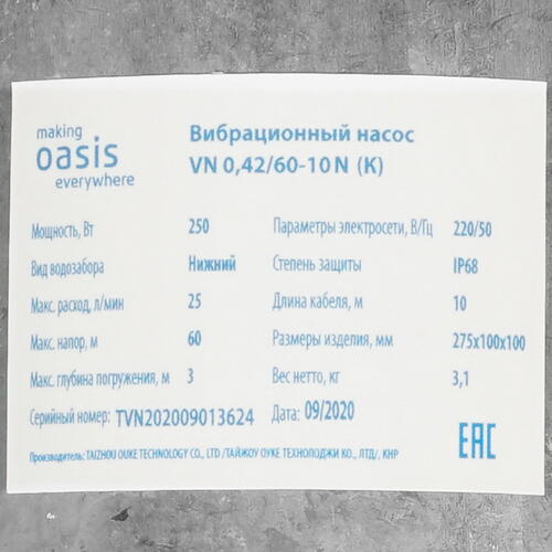 Вибрационный насос Oasis VN 0.42/60-10N [8197860]