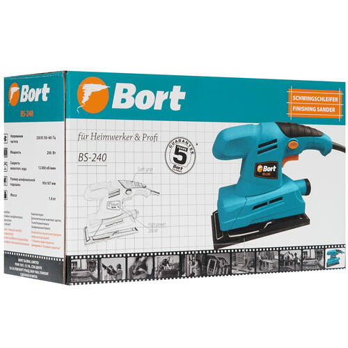 Виброшлифмашина Bort BS-240 – компактный и производительный инструмент мощностью 200 Вт, который станет надежным помощником при обработке деревянных заготовок, отделочных работах, изготовлении и ремонте мебели. Подошва предусматривает возможность совместной работы с листами 240x90 мм. Фиксация шлифовального листа осуществляется с помощью зажимного механизма. Благодаря конструкции с небольшим весом и эргономичной формой достигается комфорт при выполнении работ. Вместе с Bort BS-240 поставляются пылесборный мешок и шлифовальный лист.