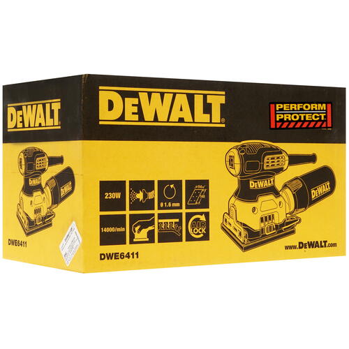 Для итоговой обработки поверхностей в DeWalt DWE 6411 используются шлифовальные листы с высокоабразивной текстурой. Зафиксировать шлифовальный лист на долговечной алюминиевой платформе можно легко и быстро благодаря простой системе его фиксации при помощи липучки. Инструмент позволяет сохранять рабочее место в чистоте: для этого достаточно подключить мешок-пылесборник или даже пылесос, втягивающий самые мелкие частицы пыли.