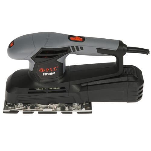Подошва вибрационной шлифовальной машины PIT PSP300-C, поддерживающей регулировку оборотов, совершает 6000-11000 колебаний в минуту. Отходы шлифования в виде мелких частиц обрабатываемого материала и абразивного покрытия отводятся через отверстия в опорной подошве шлифмашины. Инструмент весом 2 кг оборудован патрубком, решающим задачу присоединения мешка-пылесборника или пылесоса.