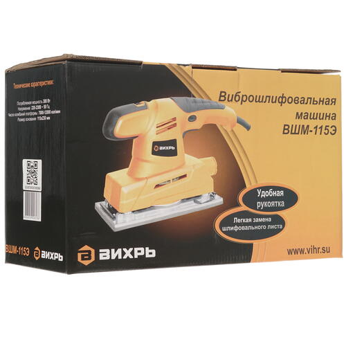 Вихрь ВШМ-115Э обладает мощностью 300 Вт. Особенность виброшлифмашины состоит в возможности регулировки частоты колебаний от 7000 до 12000 кол/мин, что позволяет подстроить ее под специфику выполняемой работы. Модель с системой отвода пыли использует дополнительно мешок-пылесборник, в который собираются опилки в процессе шлифования. Аппарат представлен в компактном корпусе и весит 2 кг. Наряду с прорезиненными элементами на корпусе это обеспечивает комфортную эксплуатацию.