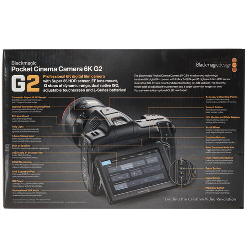 Blackmagic Design Pocket Cinema Camera 6K G2 оснащена сенсорным экраном. Подвижная конструкция позволяет регулировать его положение и удобно просматривать видео в зависимости от ракурса съемки. Режим «Фото» позволяет делать фотографии прямо в процессе записи видео. Для обмена данными реализованы порт USB, разъем HDMI и беспроводная технология Bluetooth.