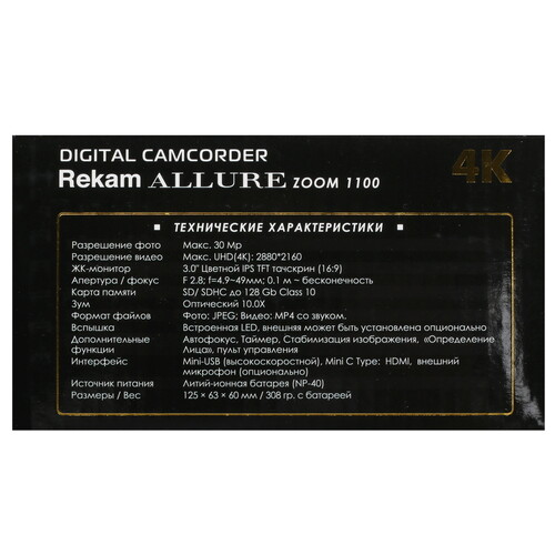 Видеокамера Rekam ALLURE Zoom 1100 благодаря компактным размерам и мягкой накладке обеспечивает удобство съемки видеоконтента. Она оснащена матрицей CMOS 30 Мп с поддержкой разрешения 4K, что гарантирует четкость передачи деталей. В модели реализован объектив с 10-кратным оптическим зумом, который имеет возможность настройки переменного фокусного расстояния в диапазоне 4.95-49.5 мм с помощью рычагов на корпусе.