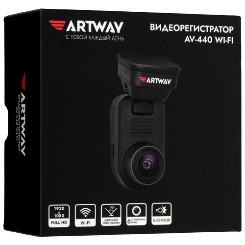 Регистратор ARTWAY AV-440 оснащен модулем Wi-fi, при подключении к которому можно будет передать отснятый материал на смартфон или другое устройство. Снимать на этой модели можно в режимах непрерывной или циклической записи с интервалом 1, 2, 3 или 5 минут. От случайных ударов во время движения устройство защитит встроенный гравитационный датчик.