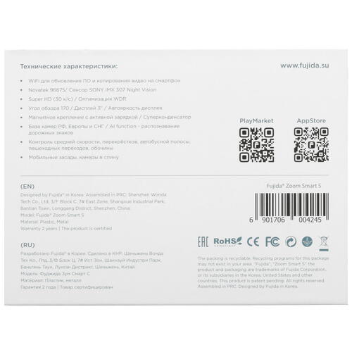 Fujida Zoom Smart S WiFi записывает видео в разрешении SuperHD с частотой 30 кадр/сек. Поляризационный фильтр сохраняет четкость изображения без бликов и отражений. Благодаря углу обзора 170° полосы движения вместе с тротуарами попадают в кадр. Вы можете использовать режимы циклической и непрерывной записи, получать сообщения о камерах и радарах по GPS, управлять настройками регистратора через мобильное приложение.