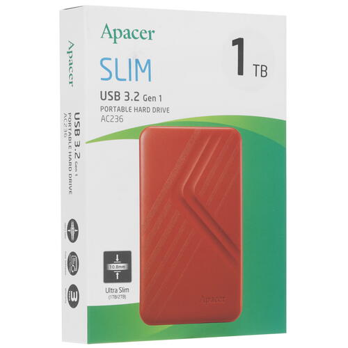 Внешний HDD Apacer AC236 обладает ярким, ультратонким корпусом из пластика красного цвета, благодаря чему помещается не только в сумку, но и в карман. Объем его памяти составляет 1 ТБ, что позволит хранить на диске коллекции музыки, фильмов и рабочие файлы. Интерфейс USB 3.2 Gen1 Type-A обеспечивает достаточно высокую пропускную способность (5 Гбит/с), поэтому чтение и запись информации происходит быстро. USB-разъем способен выдержать более 10000 подключений/отключений без снижения скорости передачи данных.