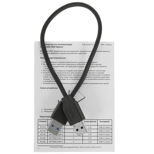 Apacer AC236 использует для подключения разъем USB 3.2 Gen1 Type-A, обратно совместимый с USB 3.0, USB 3.1 Gen1. Накопитель прошел тестирование на 10000 циклов при стабильной передаче и чтении данных. Функция интеллектуального управления питанием увеличивает срок эксплуатации HDD. При прекращении передачи данных на более 10 минут она переключает устройство в энергосберегающий режим.