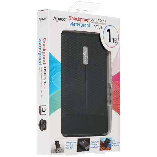 Внешнему HDD Apacer AC731 [AP1TBAC731B-1] не страшны ни капли дождя, ни пыль. Устройство облачено в герметичный корпус из пластика, соответствующий сертификату IP68. Модель полностью защищена от пыли и способна выдержать 60-минутное погружение в воду на глубину до одного метра. Конструкцией винчестера предусмотрена внутренняя антивибрационная подвеска, благодаря которой при неожиданном падении негативные последствия удара и вибрации будут минимальными. Модель представлена в классическом черном цвете корпуса.