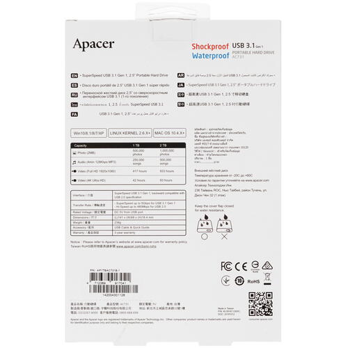 Внешний HDD Apacer AC731 [AP1TBAC731B-1] обладает объемом 1 ТБ. Такого количества свободного пространства будет вполне достаточно для хранения внушительной коллекции фильмов, музыки и фотографий. Быстрый обмен данными гарантирует впечатляющая скорость вращения шпинделя, соответствующая 5400 rpm, и объем буфера 8 МБ. Устройство оснащено интерфейсом подключения USB 3.2 Gen 1 Type A с высокой пропускной способностью 5 Гбит. Соответствующая форм-фактору 2.5" модель обладает размерами 141x88x18.4 мм.