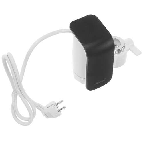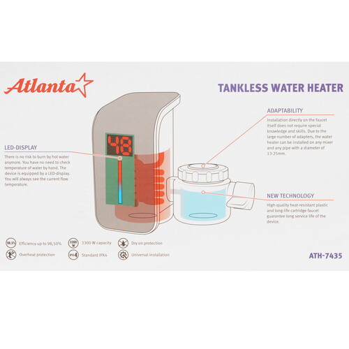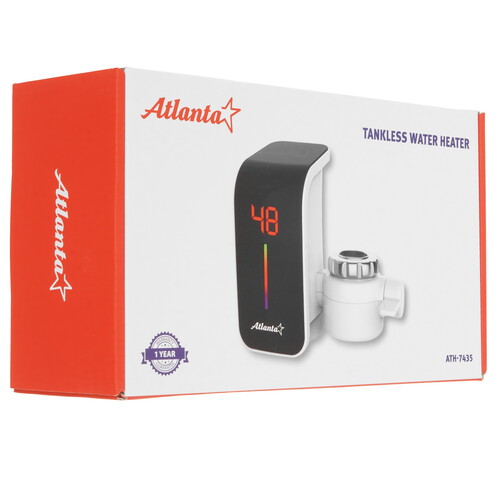 На корпусе Atlanta ATH-7435 установлен LED-дисплей. Он отображает текущую температуру воды, что позволяет избежать ожогов. Прибор поддерживает ограничение температуры нагрева и использует для регулировки поворотную ручку. Защита от перегрева предотвращает преждевременную поломку устройства. Водонагреватель подключается к сети при помощи вилки с кабелем.