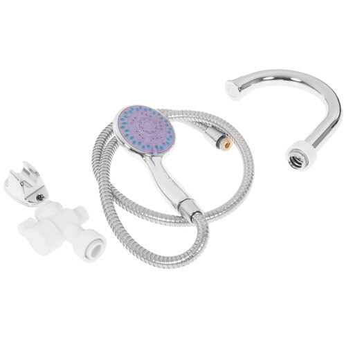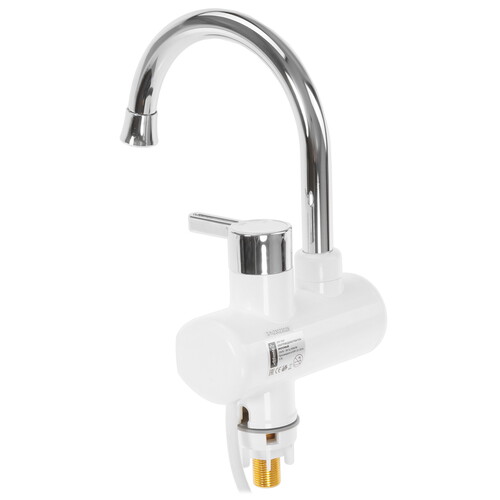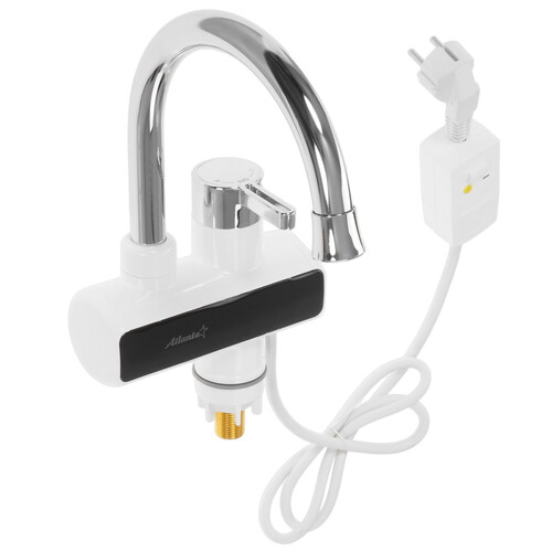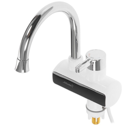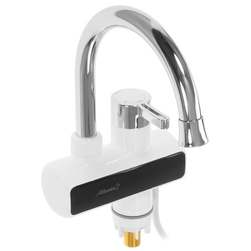 Водонагреватель Atlanta ATH-7437 размерами 10.8x23x33.5 см выполнен в виде крана с резервуаром объемом 0.009 л. В нем нагревается вода для мгновенной подачи через кран. Прибор устанавливается на раковину или ванну вместо обычного смесителя. В комплект вместе с нагревателем входит лейка и шланг для душа. Для нагрева воды до 60 °C он использует элемент мощностью 3.3 кВт.