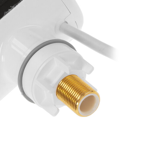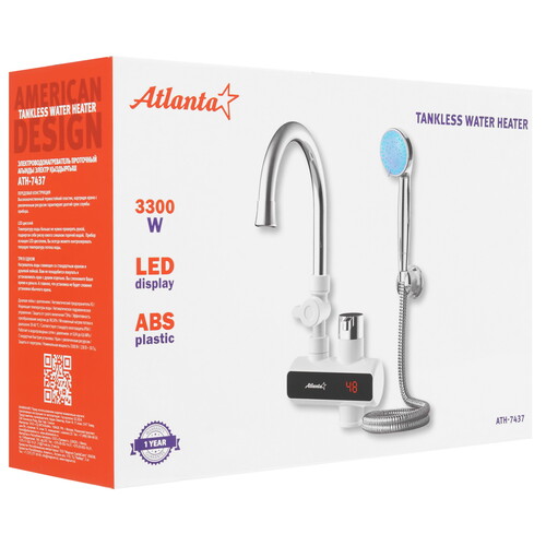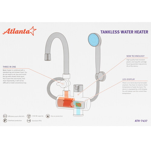 В корпус Atlanta ATH-7437 встроен LED-дисплей, который отображает текущую температуру воды. Для включения устройства и регулировки температуры воды в пределе 30-60 °C используется механическая ручка. Прибор позволяет получить до 1-3 л воды в минуту. Он поддерживает гидравлическое управление, при котором для воздействия на регулирующие узлы используется поток жидкости. Водонагреватель защищен от перегрева и включения при отсутствии воды в системе. Подключение к сети происходит при помощи кабеля длиной 1.23 м с вилкой.