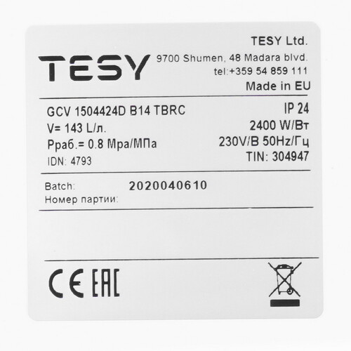 В TESY GCV 1004424D B14 TBRC реализовано простое механическое управление с поворотным регулятором и индикацией степени нагрева. Предохранительный клапан применяется для стравливания излишнего давления в баке. Водонагреватель предназначен для установки в вертикальном положении. Также отмечается технология защиты от перегрева.