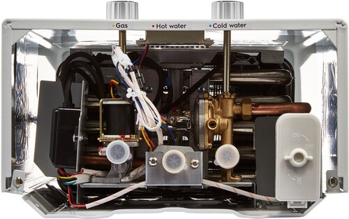 подключение - только сжиженный газ, проточный, металл, 20 кВт, 10 л/мин, до - 70 °C, управление - механическое