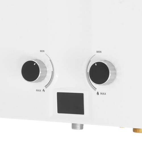 Водонагреватель газовый Ballu НС-1584737 представлен в белом металлическом корпусе с дисплеем, термометром и индикаторами. Модель с открытой камерой сгорания сжигает кислород в помещении и требует обязательной установки дымохода. Проточное устройство нагревает воду в медном теплообменнике со скоростью 10 л/мин.