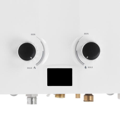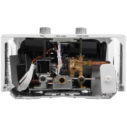 На передней стороне водонагревателя Ballu НС-1584740 расположены поворотные регуляторы и цифровой дисплей. Медный теплообменник имеет покрытие против окисления. Система многоуровневой безопасности на основе датчика тяги, защитного термостата, гидравлического предохранительного клапана и контроля ионизации пламени обеспечивает стабильную работу техники при разном уровне давления воды и газа.